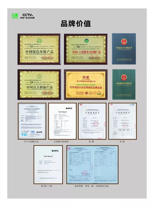 公司采用自主研发的生产模式,立足用户体验,线下为主,线上为辅,用工匠精神打造高品质产品。产品质量严格执行IS9001质量管理标准和SO14001环境管理标准。在防滑效果上,吉康脚垫底部选用毛绒爪技术,百分百抓住毛绒底面,不会打滑,确保了行车和踩踏安全。在阻燃性上,吉康脚垫通过欧盟和中国严格的阻燃性能实验测试,达到最高阻燃实验V-0级别。在环保健康上,吉康脚垫采用高质量环保PVC改性材料,通过欧盟的OHS绿色认证,符合GB18586-2001室内装饰装修材料有害物质限量国家标准。