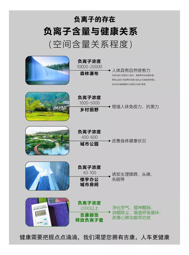 吉康脚垫释放负离子浓度在车内达到5000以上,增强人体免疫力、抗菌力;净化空气,提神醒脑,消除尘埃,增进呼吸循环,改善心肺功能等功效。