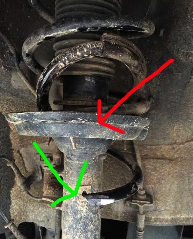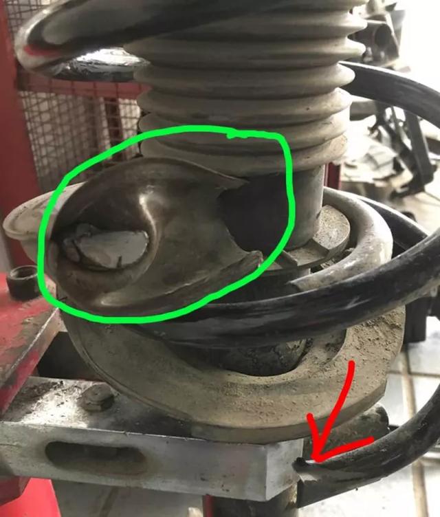 车主昨天外出游玩回家后,今天早上上班途中发现的问题。万幸车主没有听我们的建议,中午休息直接赶过来做检查。检查后师傅是惊出一身冷汗,这个故障从来没有遇到过,太危险了。上图可以看到减震弹簧竟然断了,蓝色箭头所指的就是断的弹簧,正常弹簧应该在减震器弹簧的托盘上